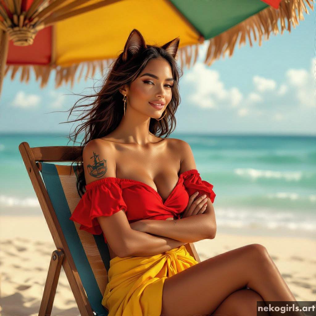 A Cat girl relaxing on a tropical beach.